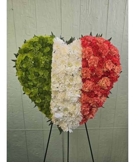 Your sympathy and love will be beautifully expressed through this heartfelt tribute to their Irish heritage. This arrangement features a striking Irish flag design crafted from fresh flowers, elegantly displayed on a heart-shaped form—creating a meaningful and memorable symbol of remembrance.